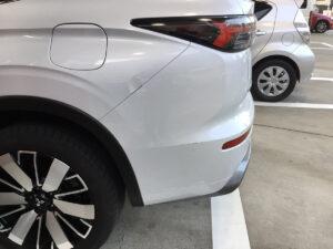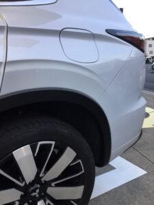 ミツビシ アウトランダーをお乗りのお客様よりWEB診断画像を頂き、金額査定をさせてもらいました。左リアのクォーターパネルのヘコミとリアバンパーの鈑金塗装のお見積りをご提示したところ、ご納得頂き作業させて頂きました。目立つヘコミのキズが全く目立たなくなってとても満足されてました!